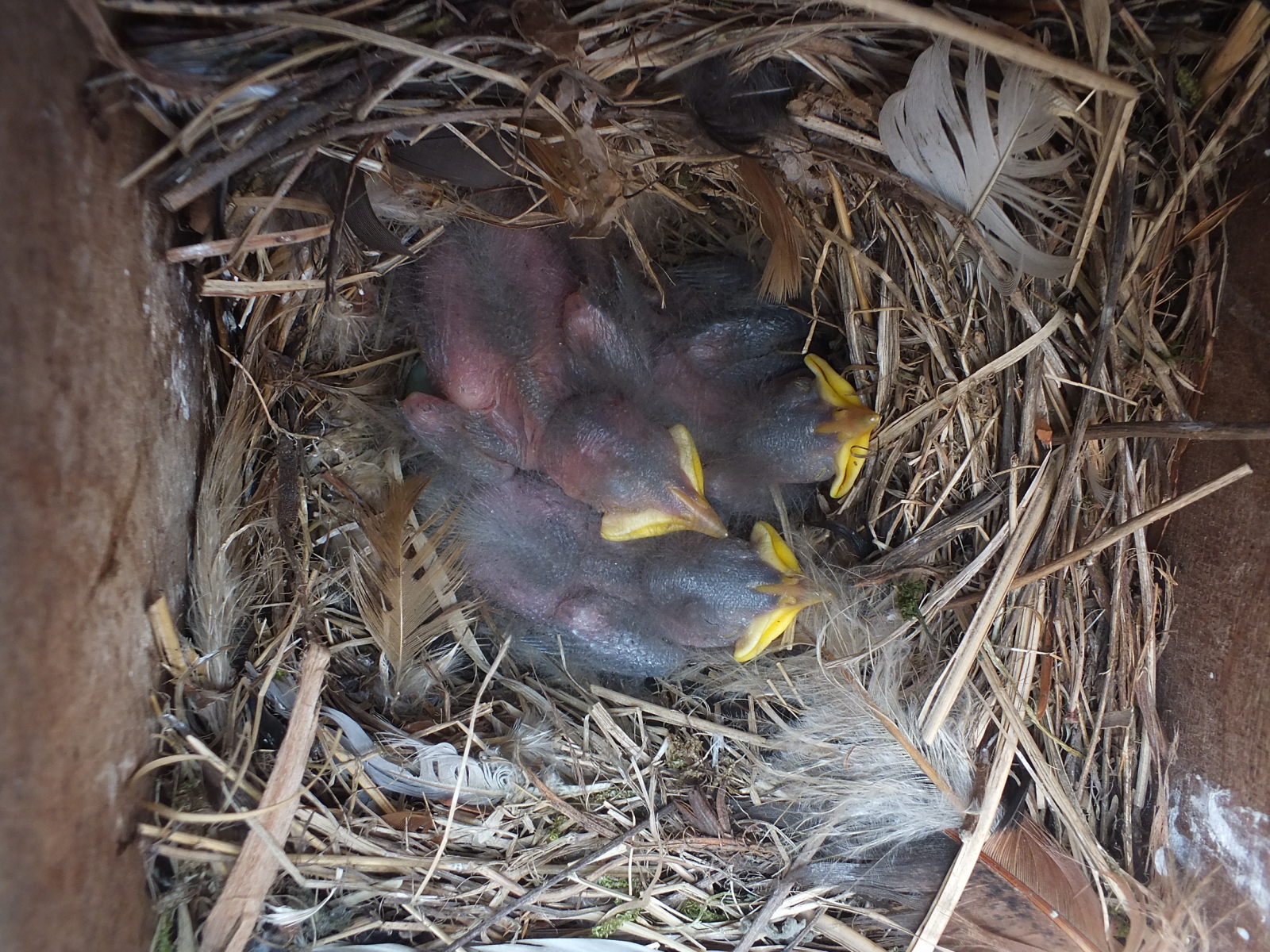 Špaččí hnízdo i s malými špačky. (Foto je z kroužkování.)