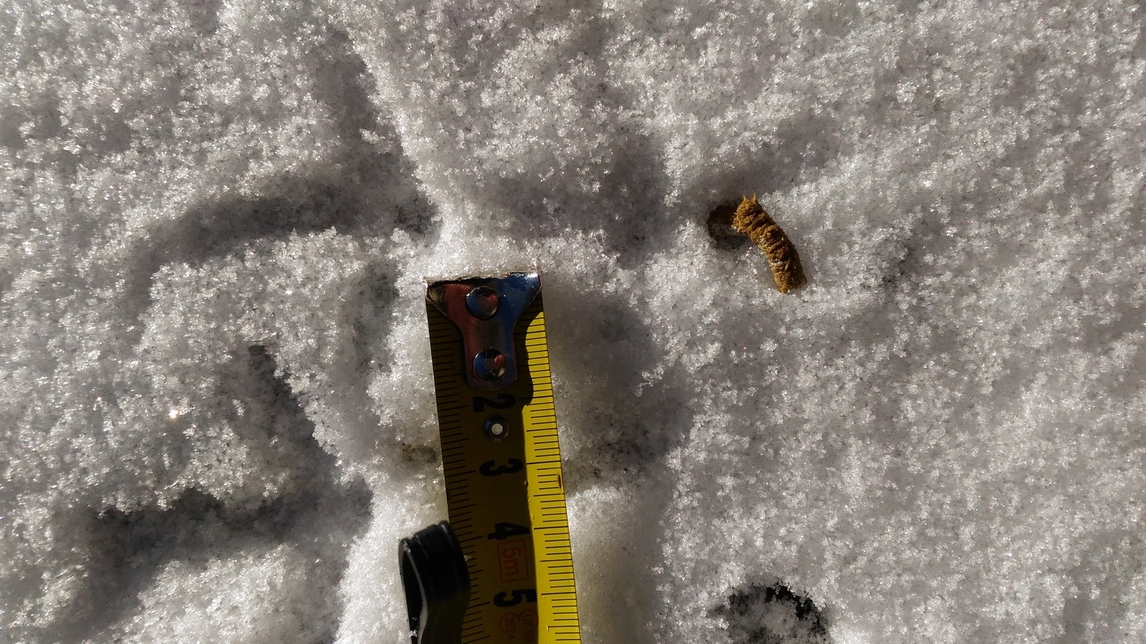Stopní drahy motající se po cestě jedna vedle druhé (dle mě docela typické). V zatáčce je vidět malé zastavení a důvod leží hned vedle - trus.