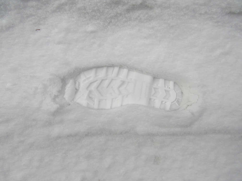 Rychlá chůze (sníh vykopnutý špičkou, stopa se láme, odpichující přední část chodidla rozdrolí vzorek)