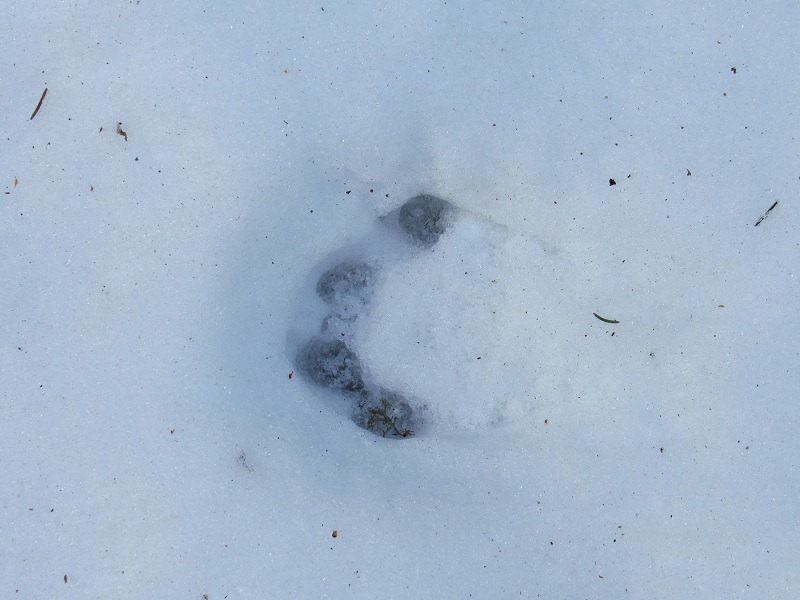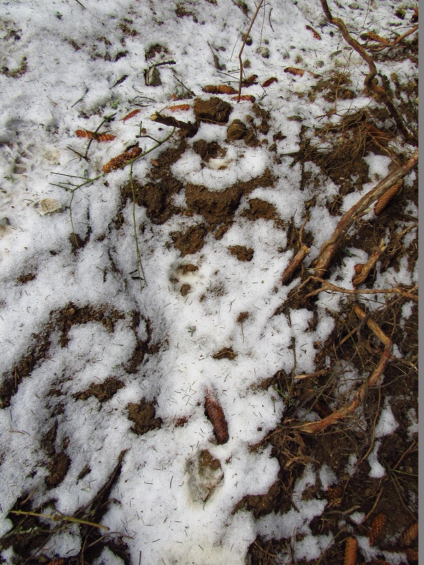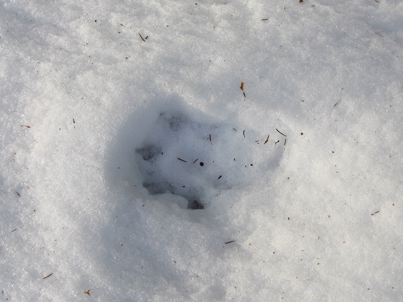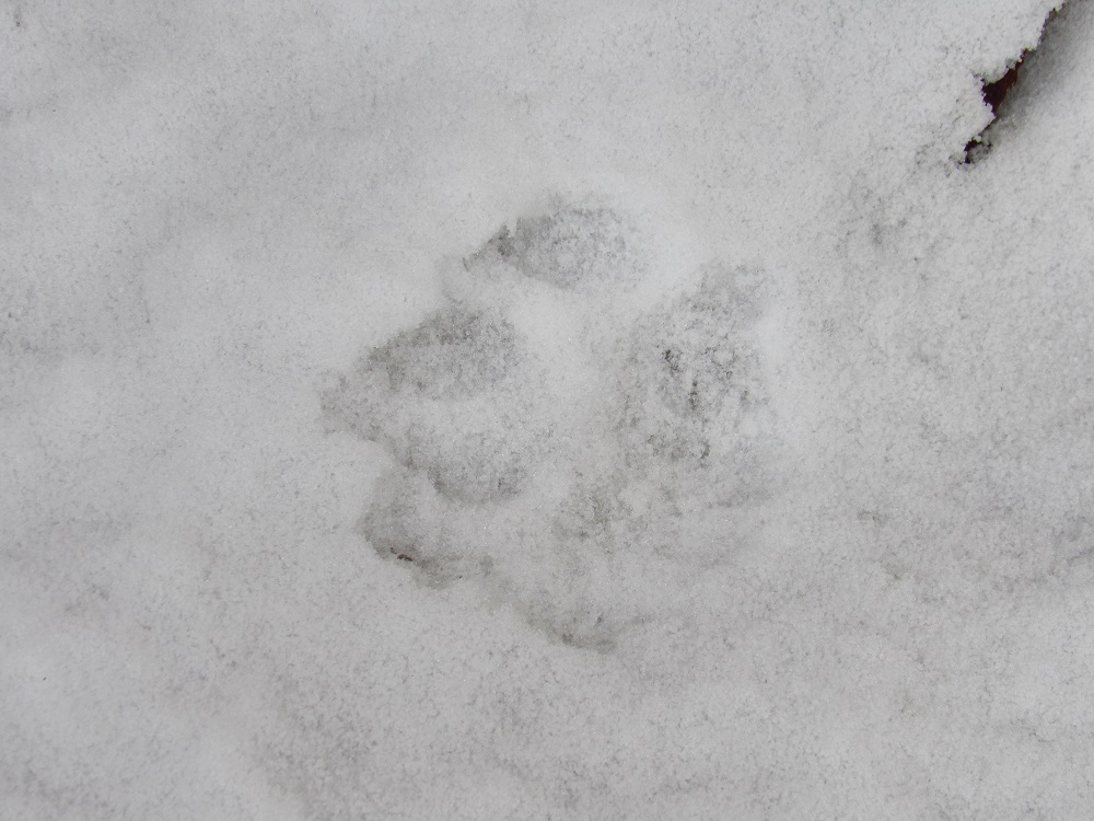 S ohledem na úhel kamene je dle mě nemožné, aby šlo o kopytníka (a noha zvířeti dál neujela). Ve stejné stopě se nám také podařilo nalézt nezasněžený, čitelnější otisk. V něm je patrný otisk tlapy. Částečně patrné rozložení prstů a patního mozolu napovídá na rysa, chybějící známky drápů nám v tomto případě pomohou vyloučit mýlku se psem: