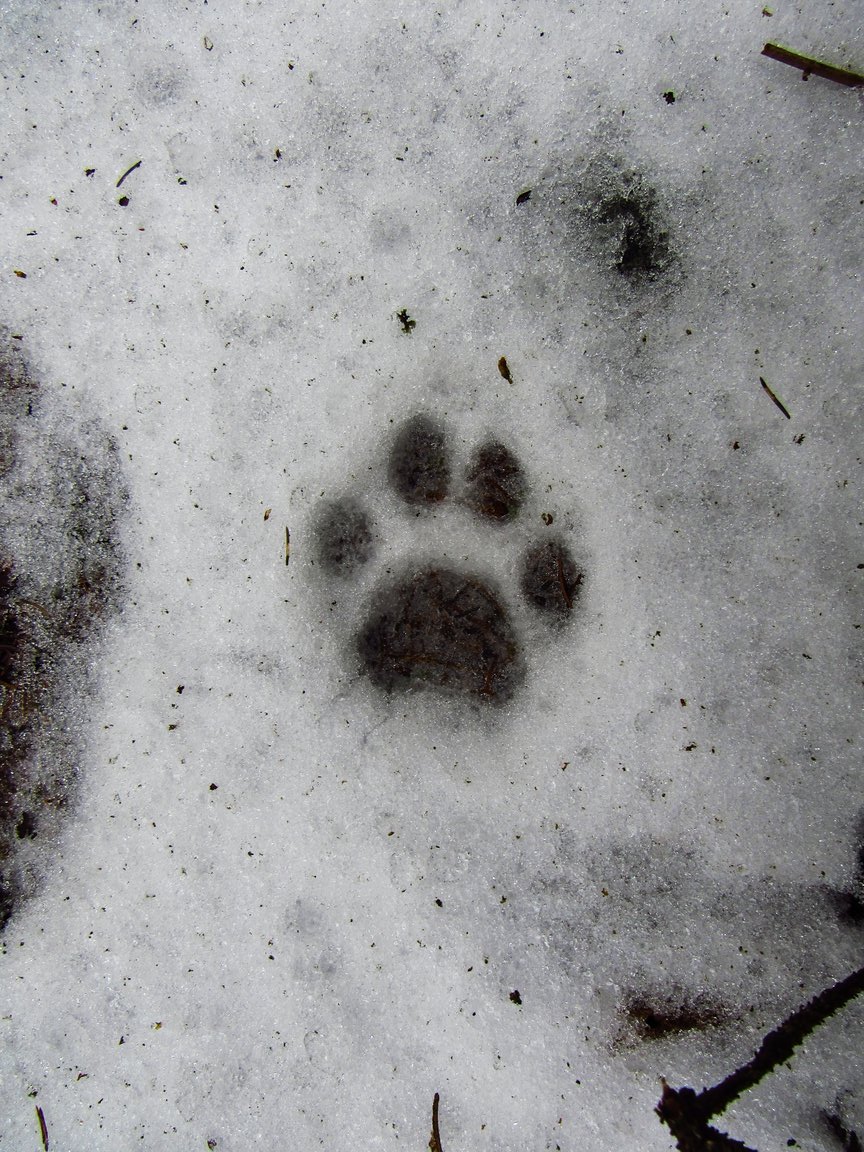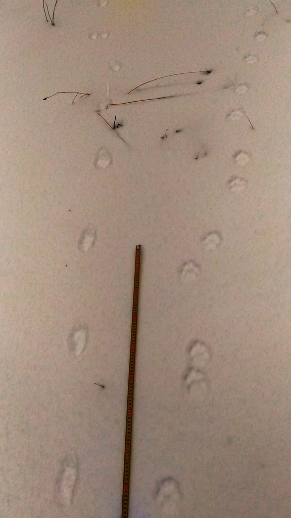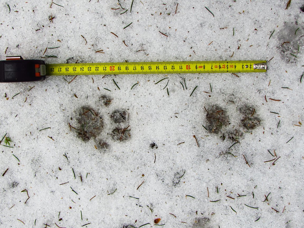 - Typická stopní dráha, šelma je v klusu a předvádí tzv. čárování. Všimněte si dvojotisku. V terénu a zvláště v hlubokém sněhu může být na první pohle podobná stopní dráze jelena - stačí jedne pohled do stopy (spárky x prsty).