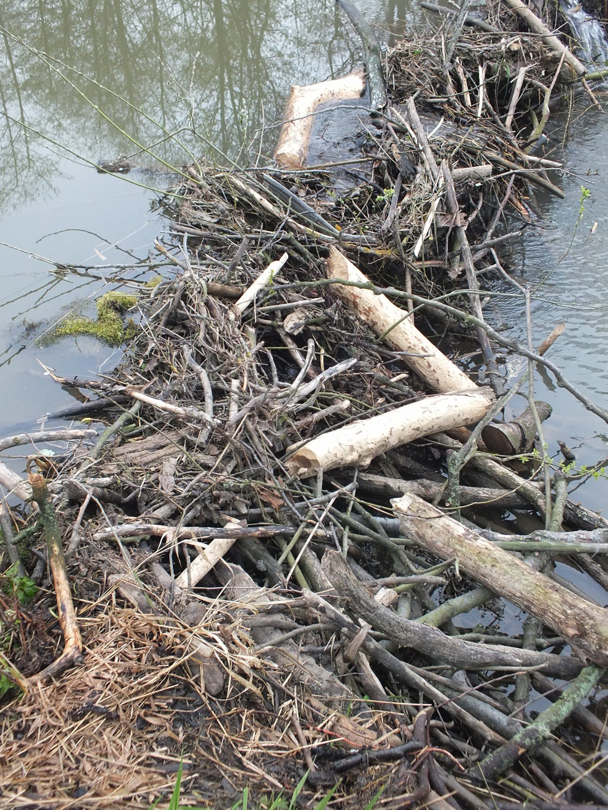 Detail. Na první pohled mohou bobří stavby někdy působit jako naplaveniny, povšimněte si však větví pevně zabudovaných do zbytku stavby.