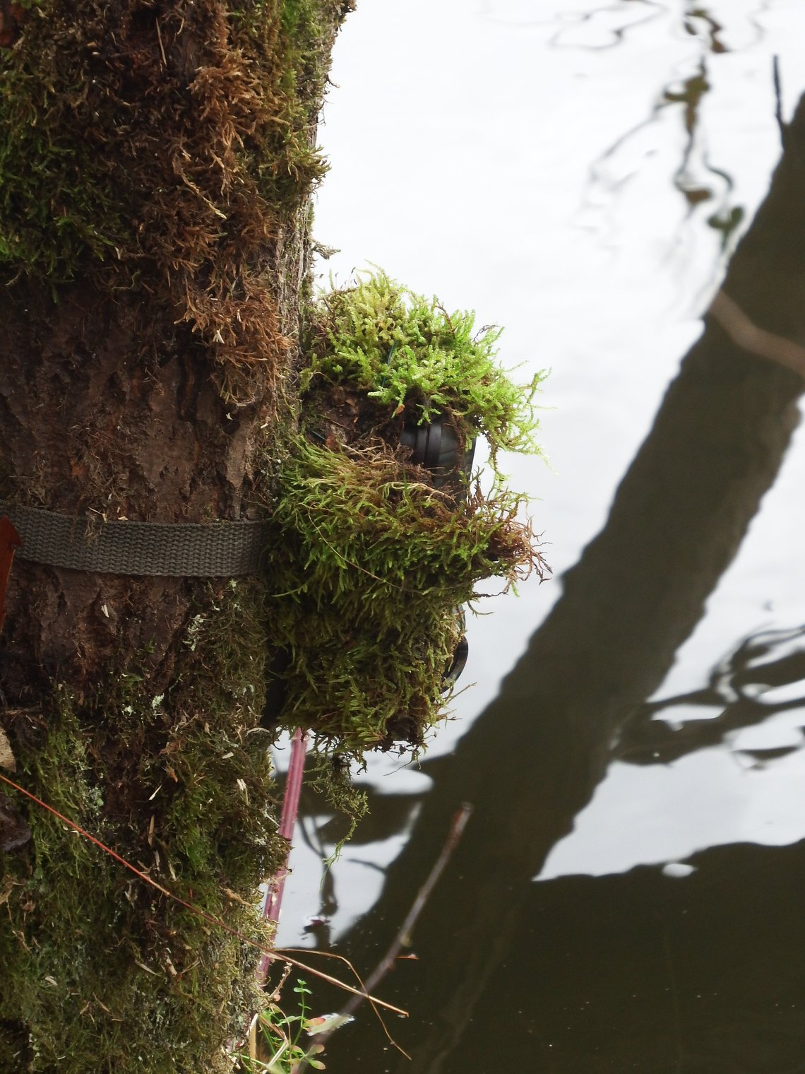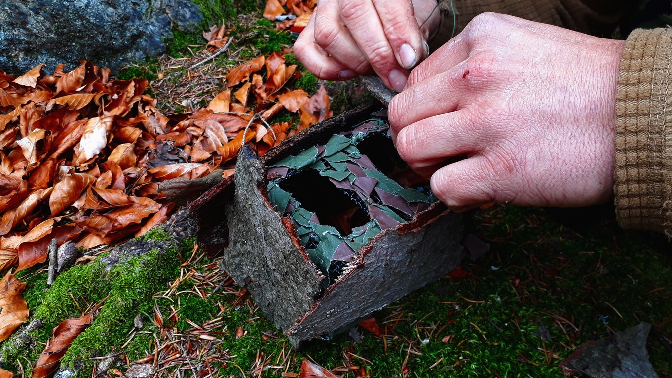 Maskování fotopastí: Maskování pomocí kusů borky přichycených vázacím drátem