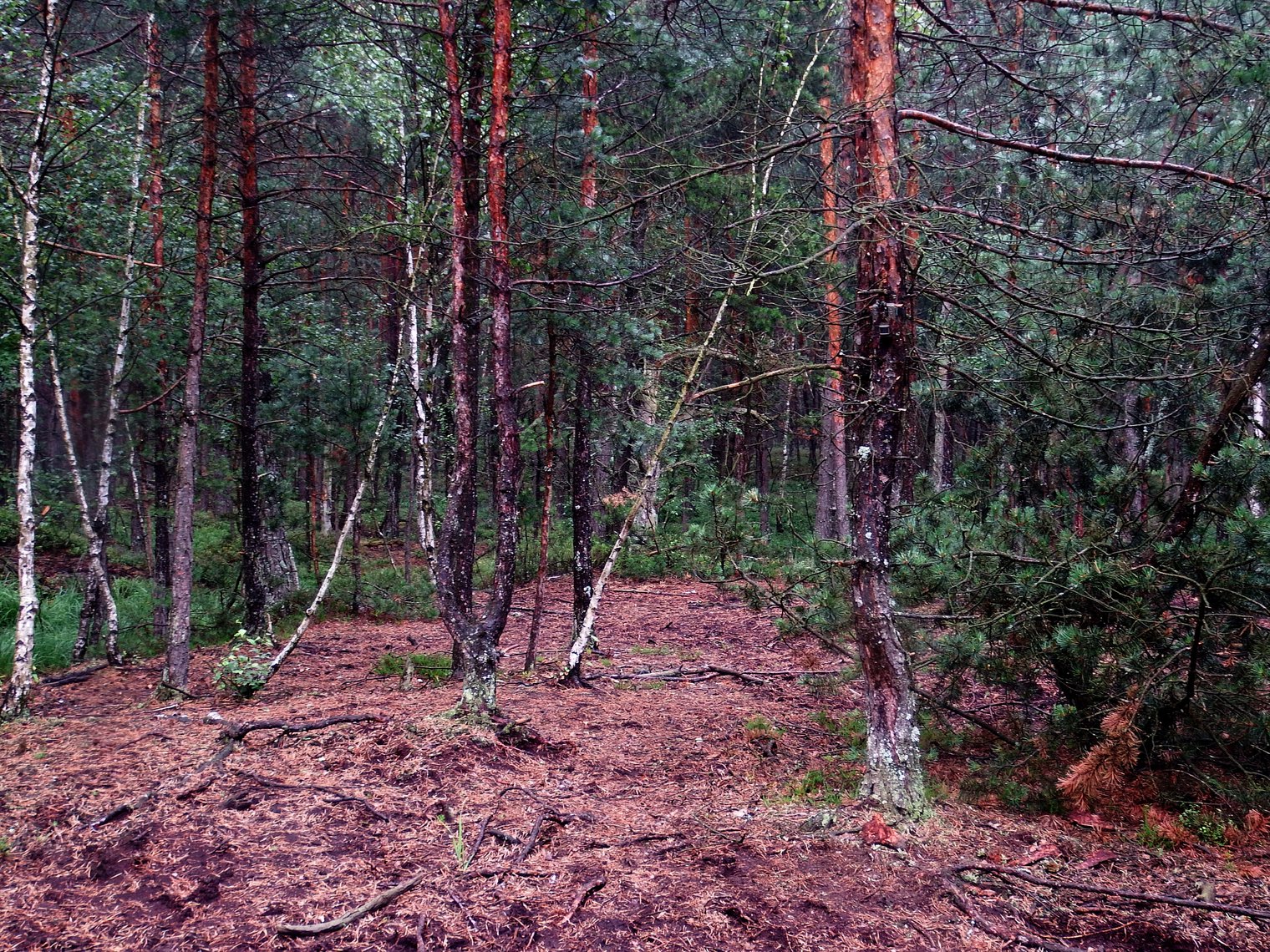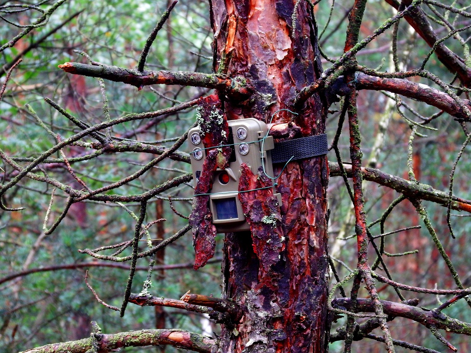 Maskování fotopastí: Fotopast ukrytá na jedné z borovic stranou od mýtiny