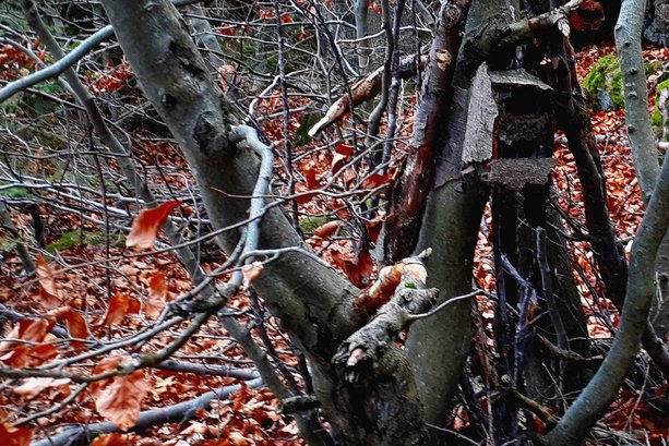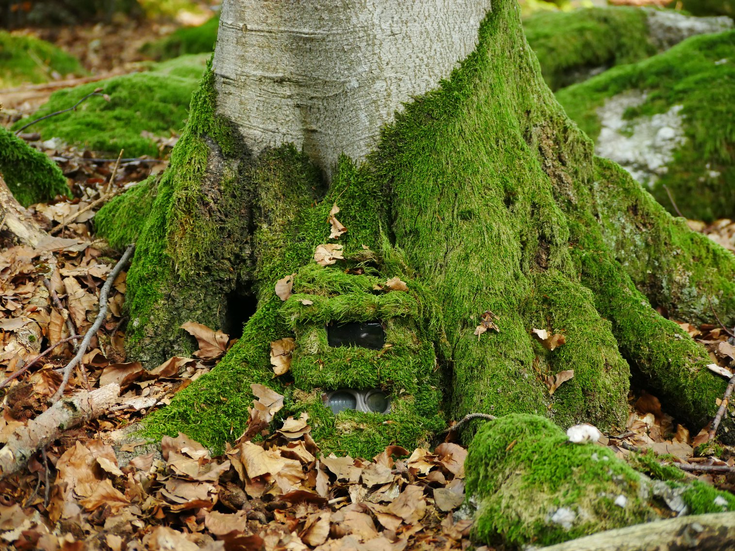 Maskování fotopastí: Detail ukryté fotopasti. Listy jsou však uchycené velmi nedostatečně, je štěstí že na pasti vydržely a nepřekryly objektiv nebo některé z čidel
