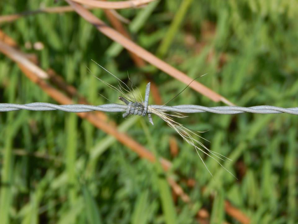 Jezevčí srst zachycená na ostnatém drátě dobytčí ohrady v místě, kde jezevec přelézal kamennou zídku.