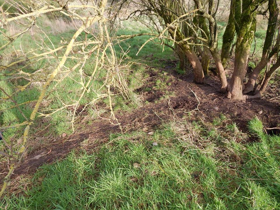 Vychozená jezevčí stezka k podrápaným a zabláceným kmenům stromů.