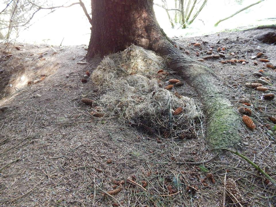 Jezevčí srst nalezená v různých lokalitách na spodních drátech ohradníků, u kořisti kolem doupěte a nebo na klenbě vstupu do doupěte.