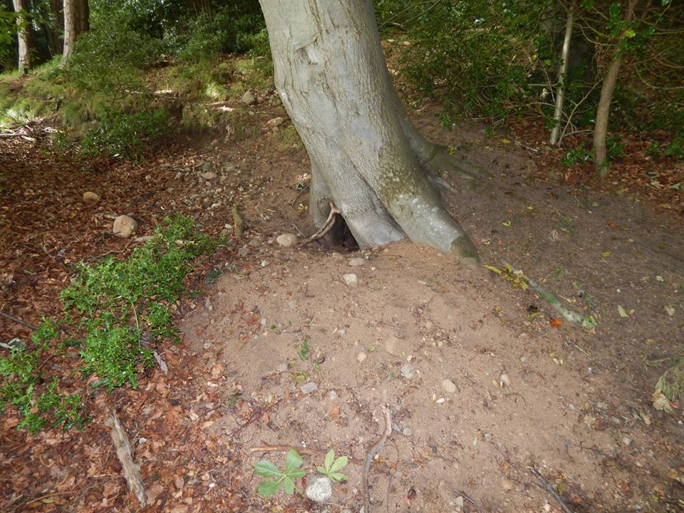 Vstup do jezevčí nory je přímo v kořenech buku.
