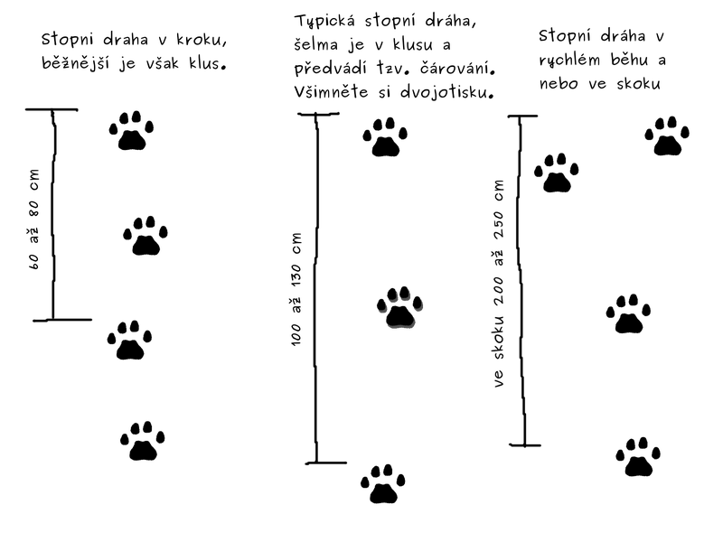 Pozn. Psích druhů je hodně, liší se velikostí i stavbou těla. Psí stopy tak mohou být velmi rozdílné a některé znaky mohou postrádat. Hodně napoví chování zvířete.