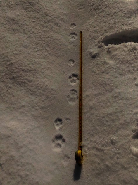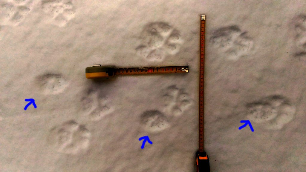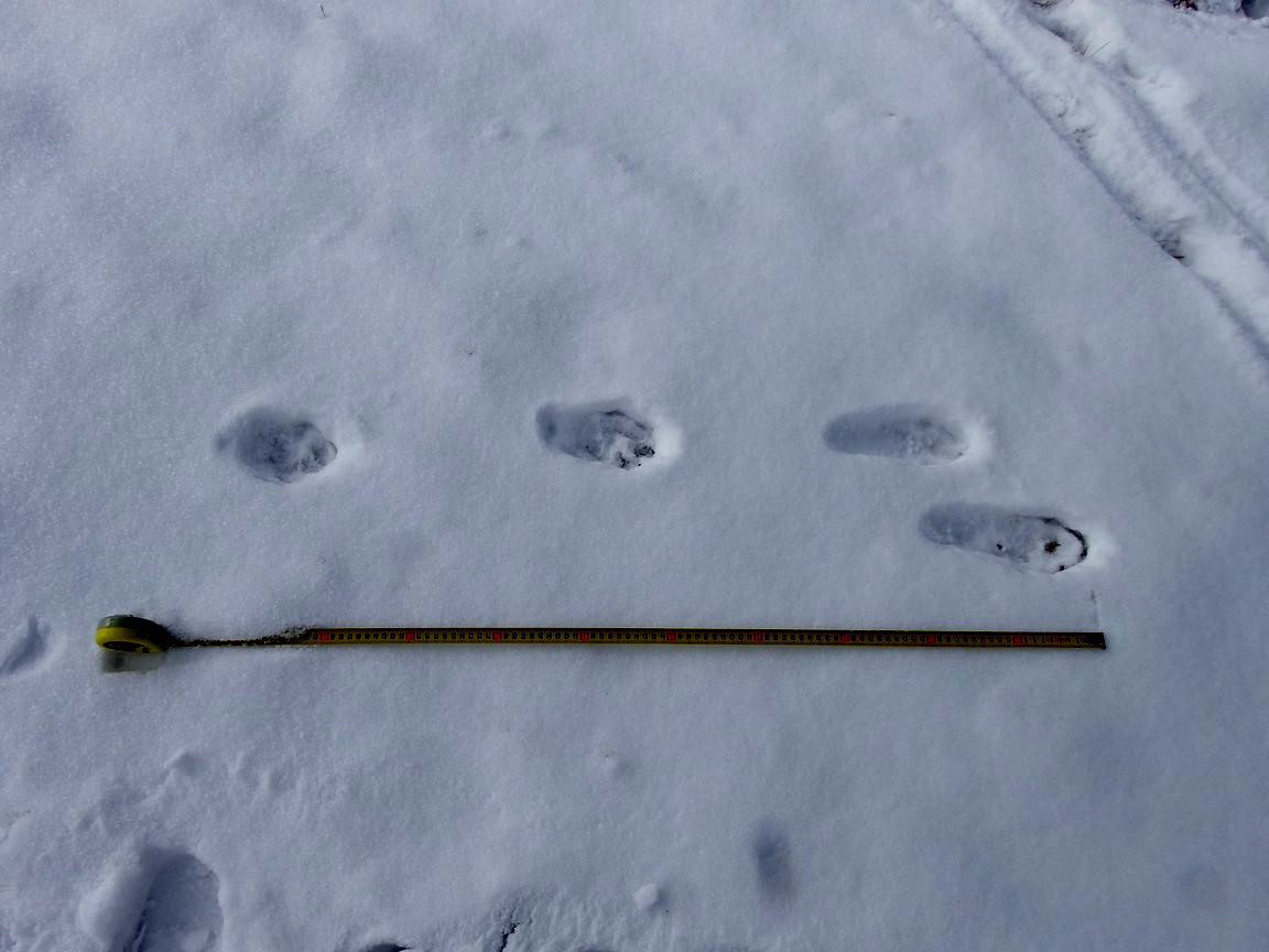 - Typická stopní dráha, šelma je v klusu a předvádí tzv. čárování. Všimněte si dvojotisku. V terénu a zvláště v hlubokém sněhu může být na první pohle podobná stopní dráze jelena - stačí jedne pohled do stopy (spárky x prsty).