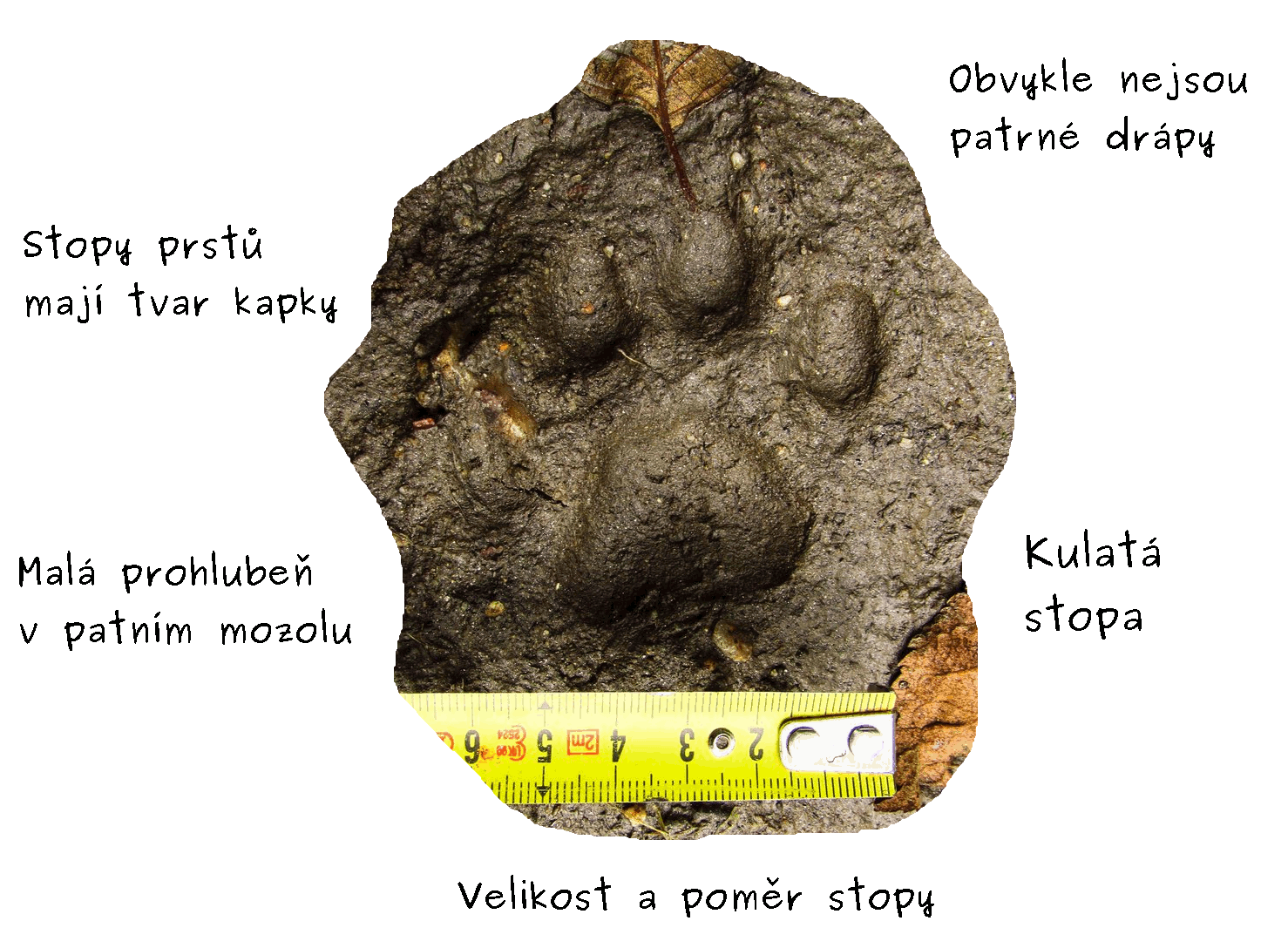 - Tvar prstů. Povšimněte si zvláště těch bočních (pozn. u mělkých stop nemusí být patrné). Pro rysa jsou typické oválné "kapky".