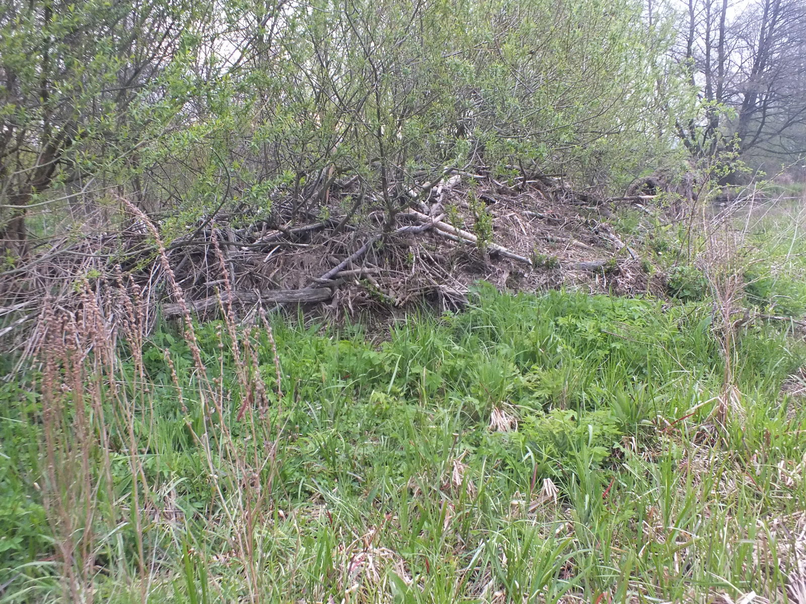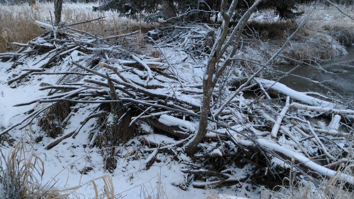Detail. Na první pohled mohou bobří stavby někdy působit jako naplaveniny, povšimněte si však větví pevně zabudovaných do zbytku stavby.