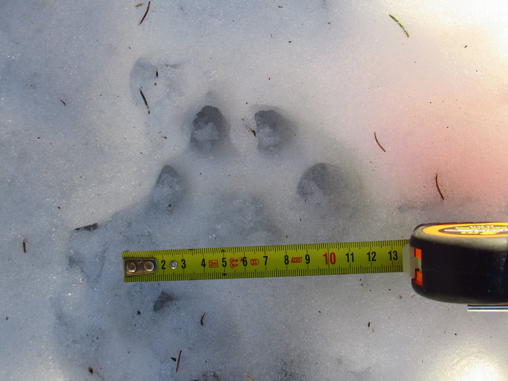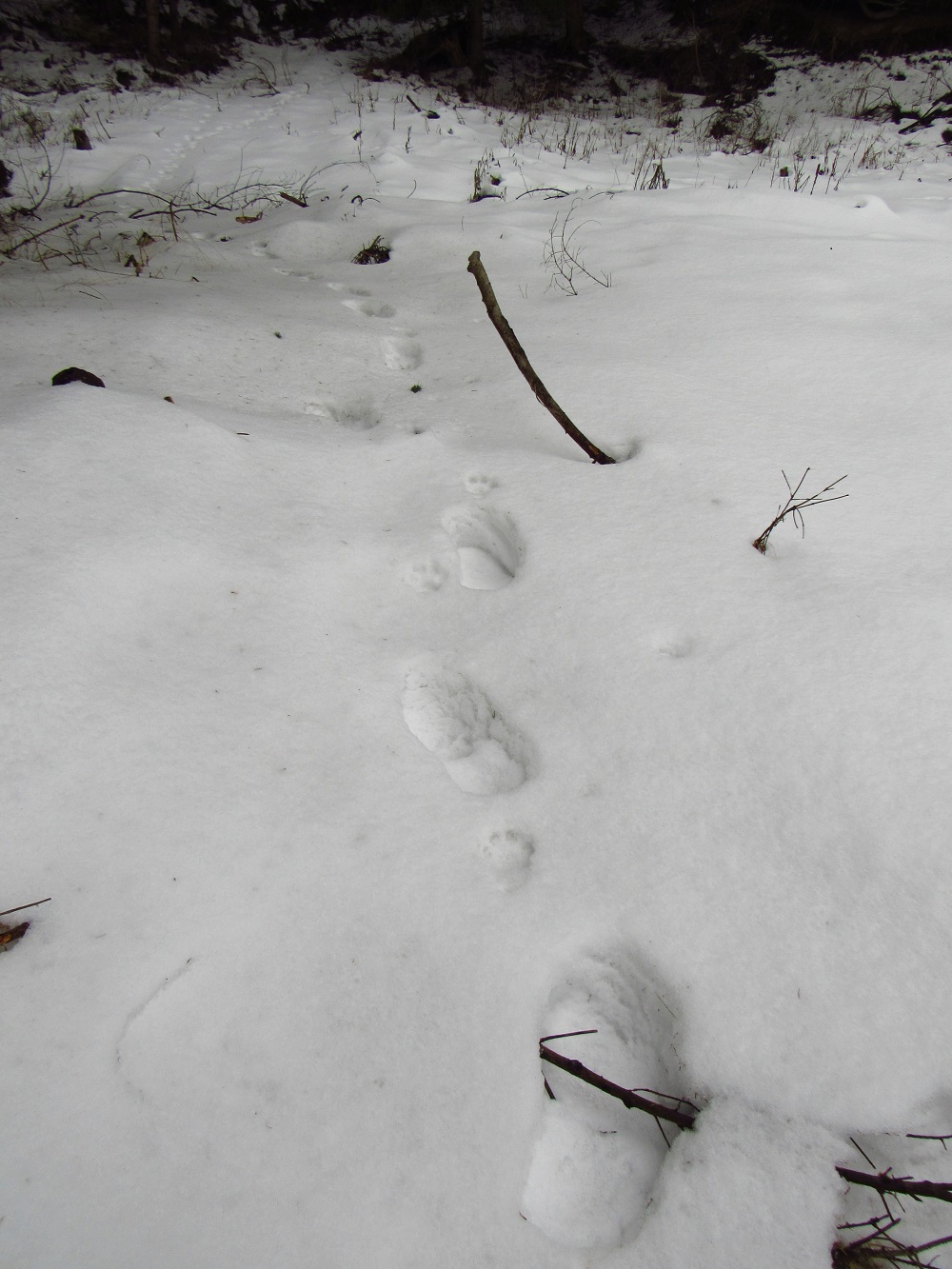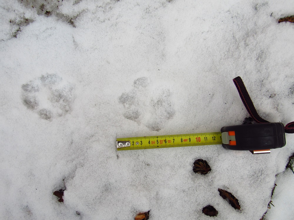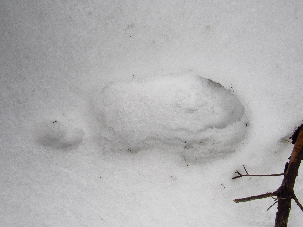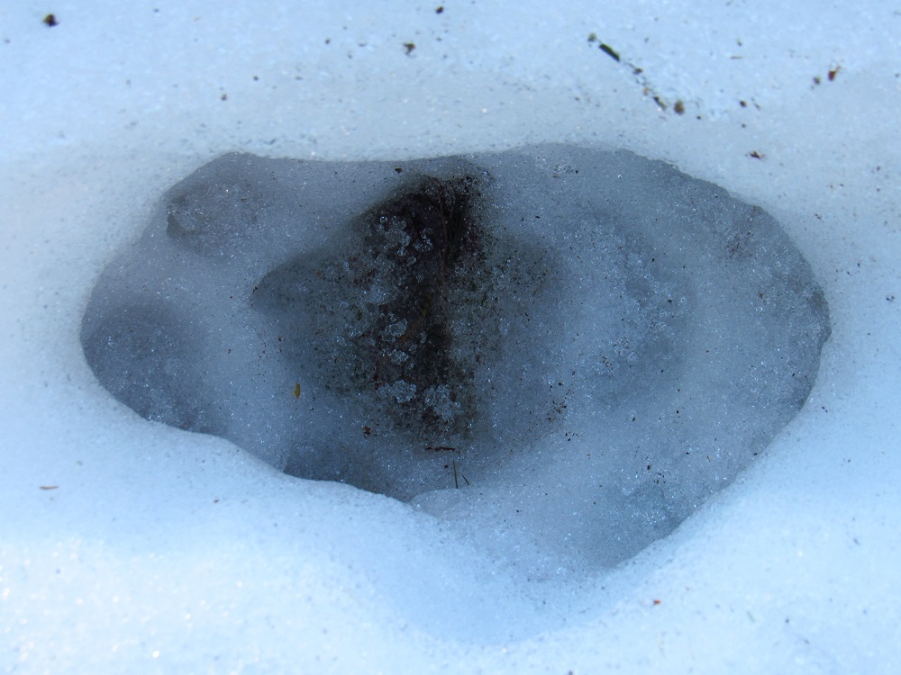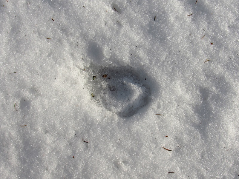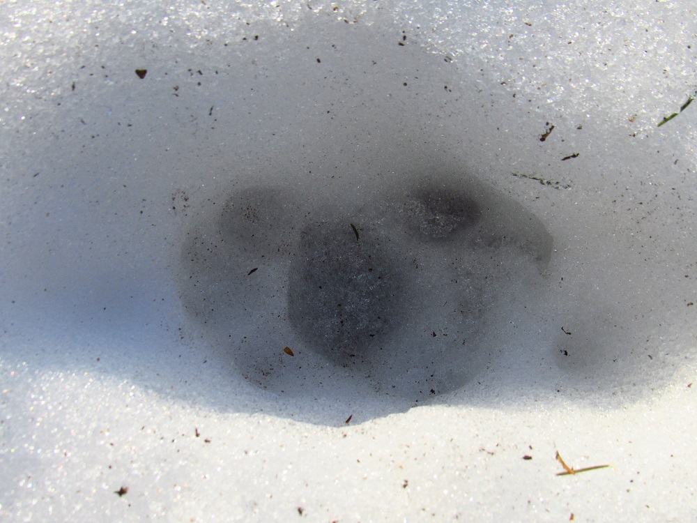 S ohledem na úhel kamene je dle mě nemožné, aby šlo o kopytníka (a noha zvířeti dál neujela). Ve stejné stopě se nám také podařilo nalézt nezasněžený, čitelnější otisk. V něm je patrný otisk tlapy. Částečně patrné rozložení prstů a patního mozolu napovídá na rysa, chybějící známky drápů nám v tomto případě pomohou vyloučit mýlku se psem: