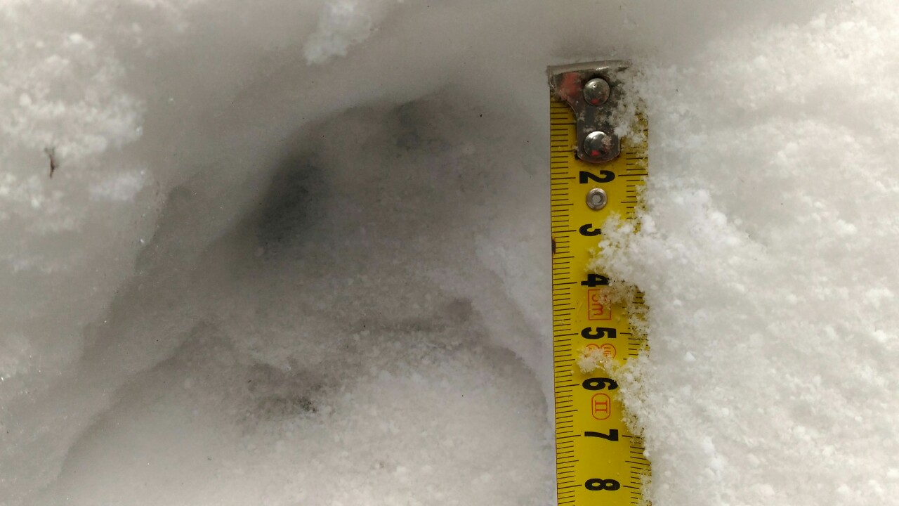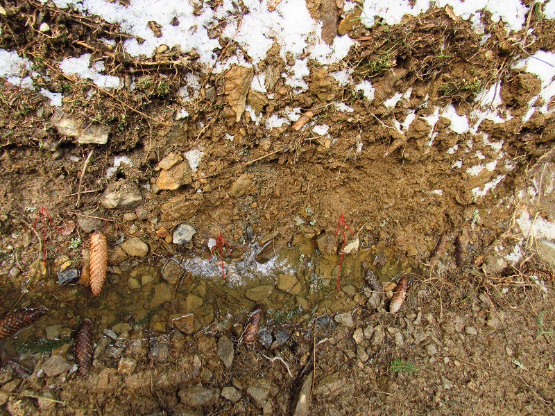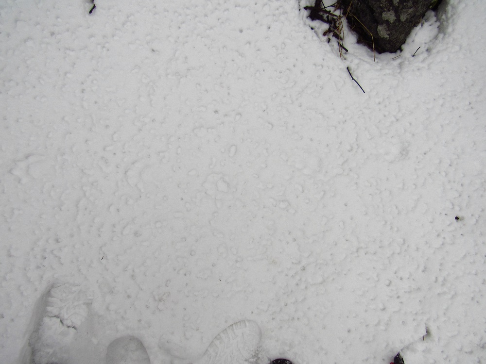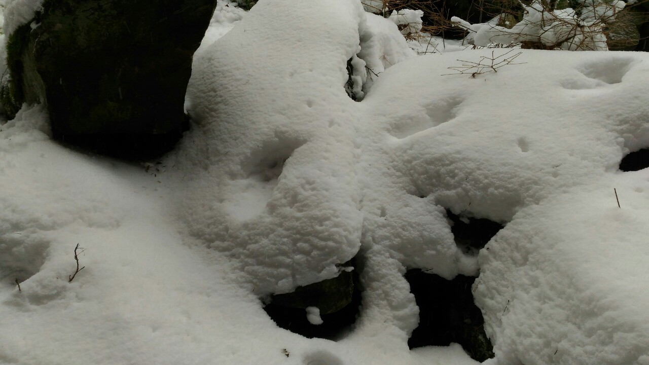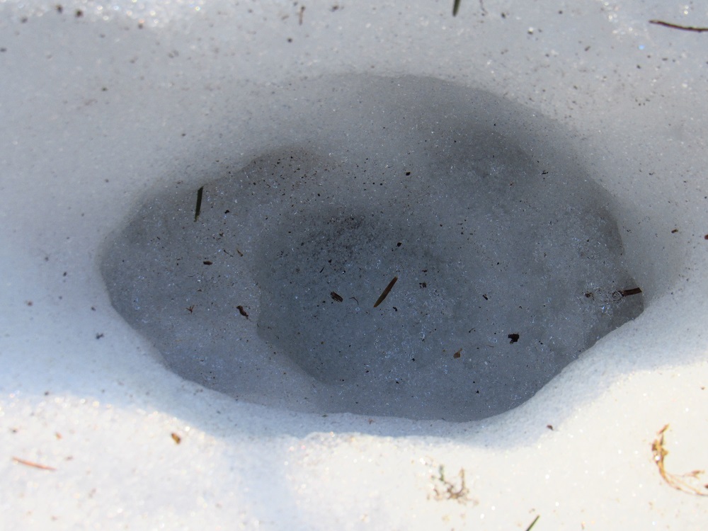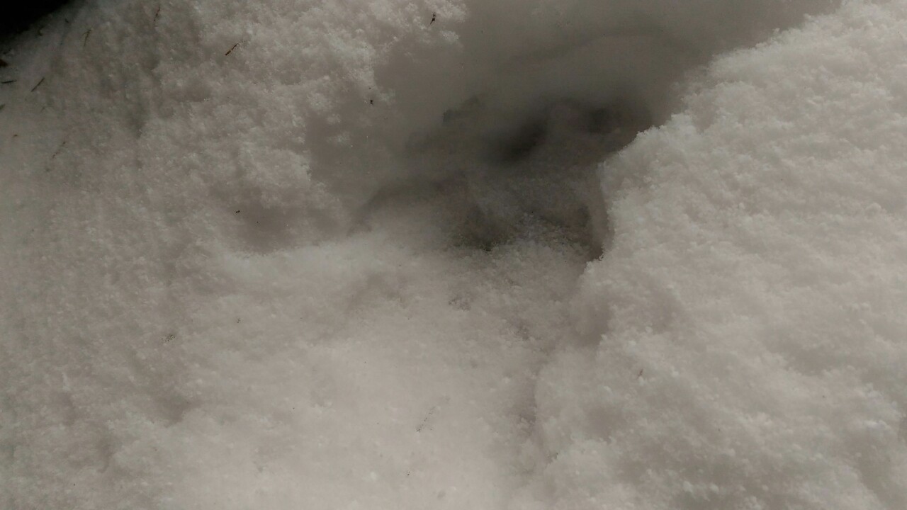 S ohledem na úhel kamene je dle mě nemožné, aby šlo o kopytníka (a noha zvířeti dál neujela). Ve stejné stopě se nám také podařilo nalézt nezasněžený, čitelnější otisk. V něm je patrný otisk tlapy. Částečně patrné rozložení prstů a patního mozolu napovídá na rysa, chybějící známky drápů nám v tomto případě pomohou vyloučit mýlku se psem: