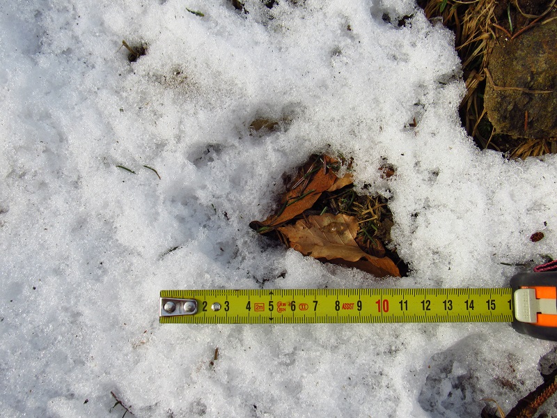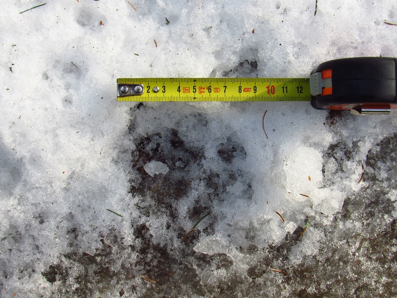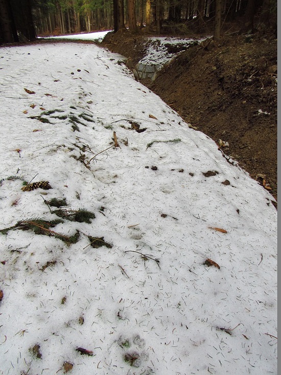 Rys ostrovid, starší stopy při rychlém tání sněhu.