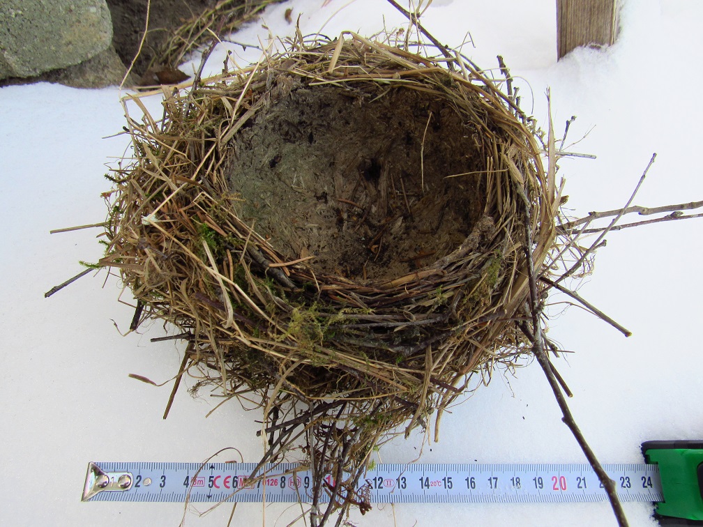 Mělo by jít o staré hnízdo drozda zpěvného. Hnízdo staví ze suché trávy, stonků, větviček a mechu (dle Svenssona slouží mech k maskování). Vnitřní část je vymazána směsí hlíny, ztrouchnivělého dřeva a slin. Hnízdo je díky tomu velmi odolné (často přežívá i měsíce po jeho opuštění - ostatně moje fotka je z podzimu) a též dobře rozpoznatelné od ostatních drozdů.