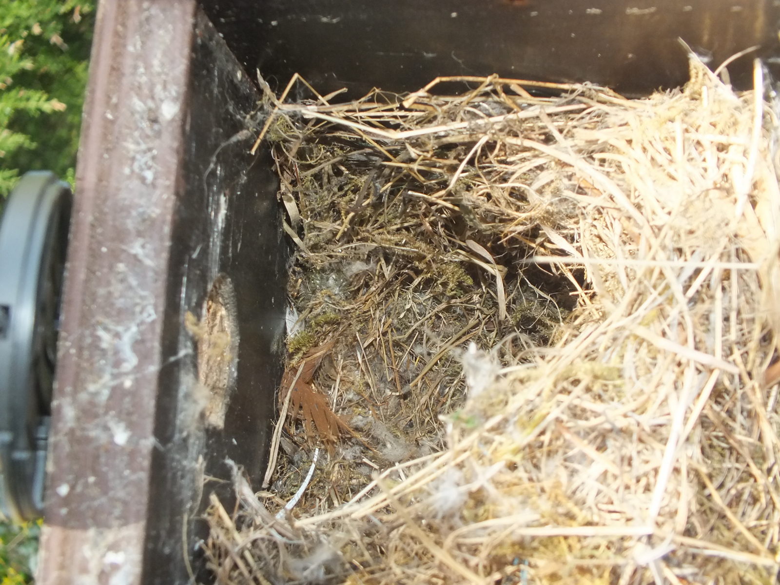 Vrabčí hnízdo uvnitř budky. Je vystlané až po vrch - vrabec si staví hnízdo uzavřené i shora.