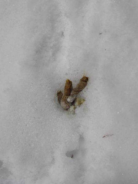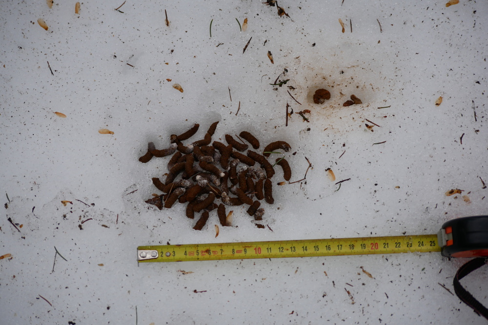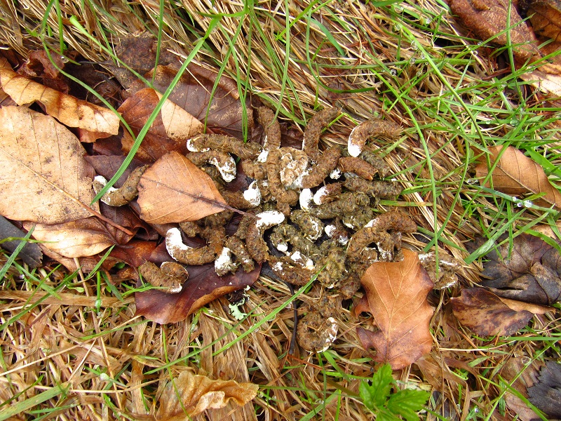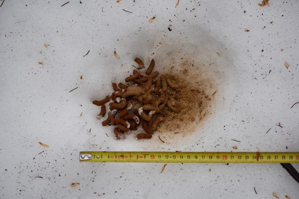 Stopní drahy motající se po cestě jedna vedle druhé (dle mě docela typické). V zatáčce je vidět malé zastavení a důvod leží hned vedle - trus.
