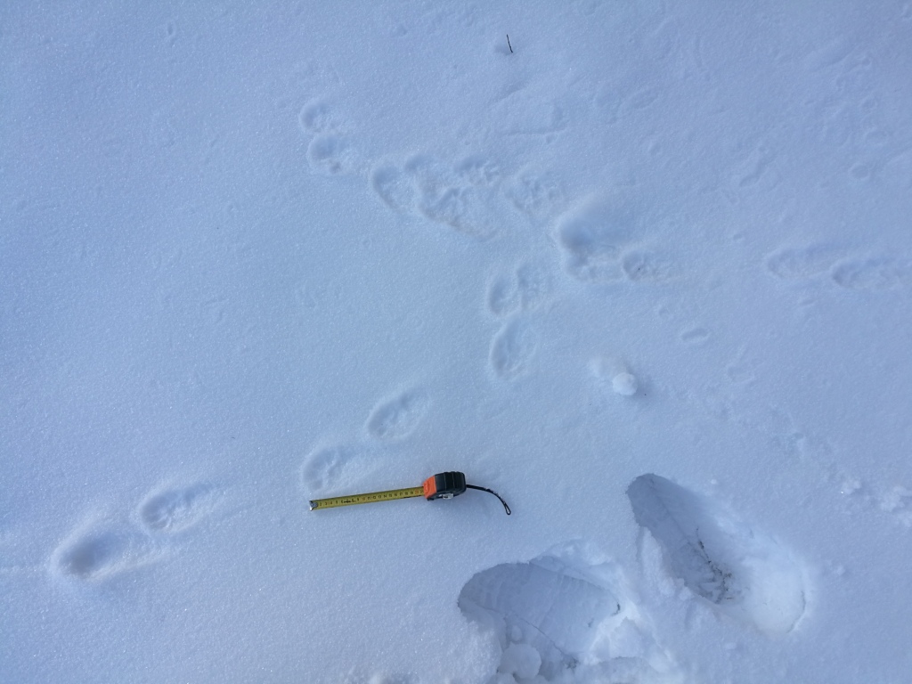 potřeboval bych trochu napovědět. Nejsem si moc jistý určením, stopy nebyly čitelné kvůli prašanu. Pouze v jednom místě jakž takž šly přečíst, ale stejně si nejsem moc jistý. Takže jsem zkoušel rozpoznat podle stopní dráhy a chování. Na začátku to dvěma skoky vyskočilo na cca 2 m vysokou hranu úvozu dále to pak seskočilo z 1,80 m starého základu chalupy. Délka kroku cca 100-120. Na konci to podlezlo kmen cca 25 cm nad terénem. Tipoval bych lišku, ale dost mě zarazily ty velké skoky.