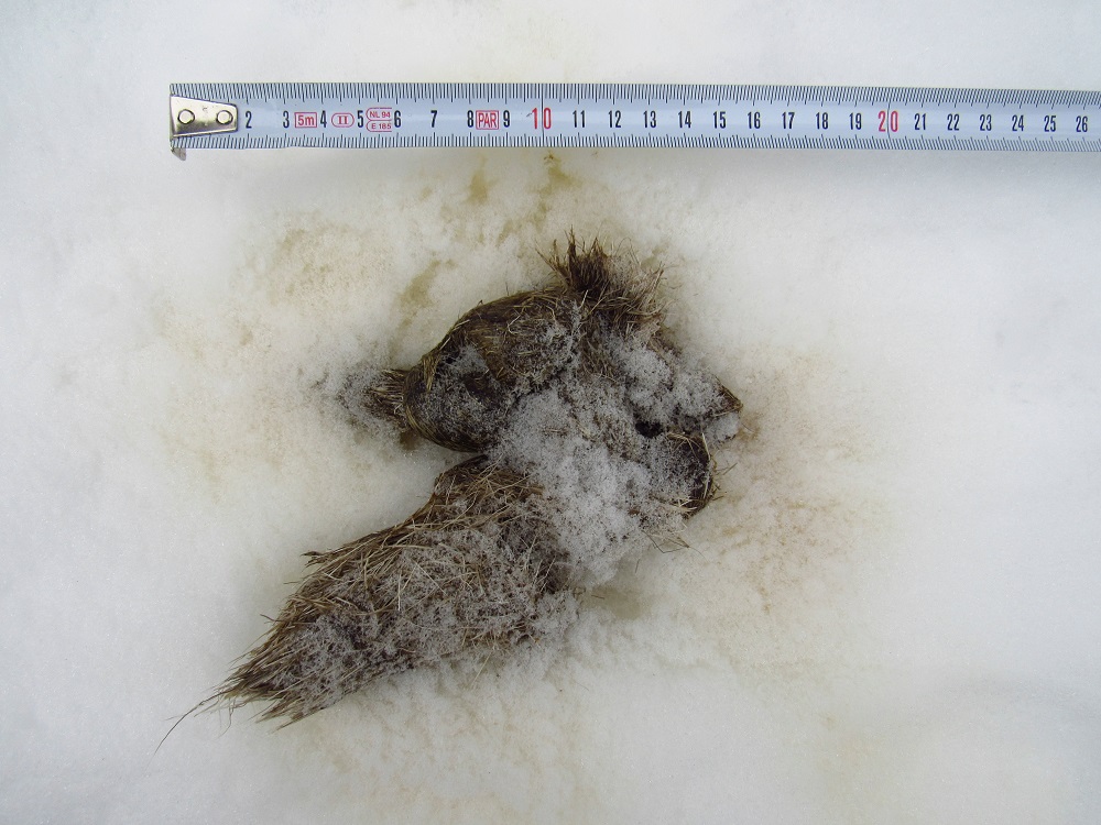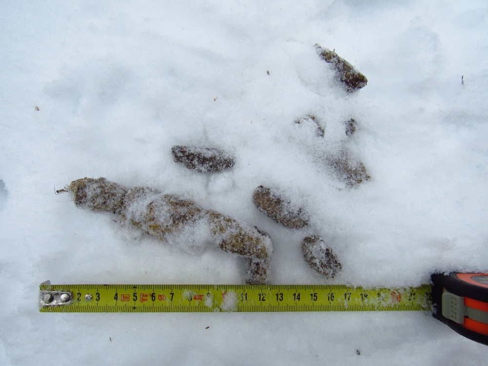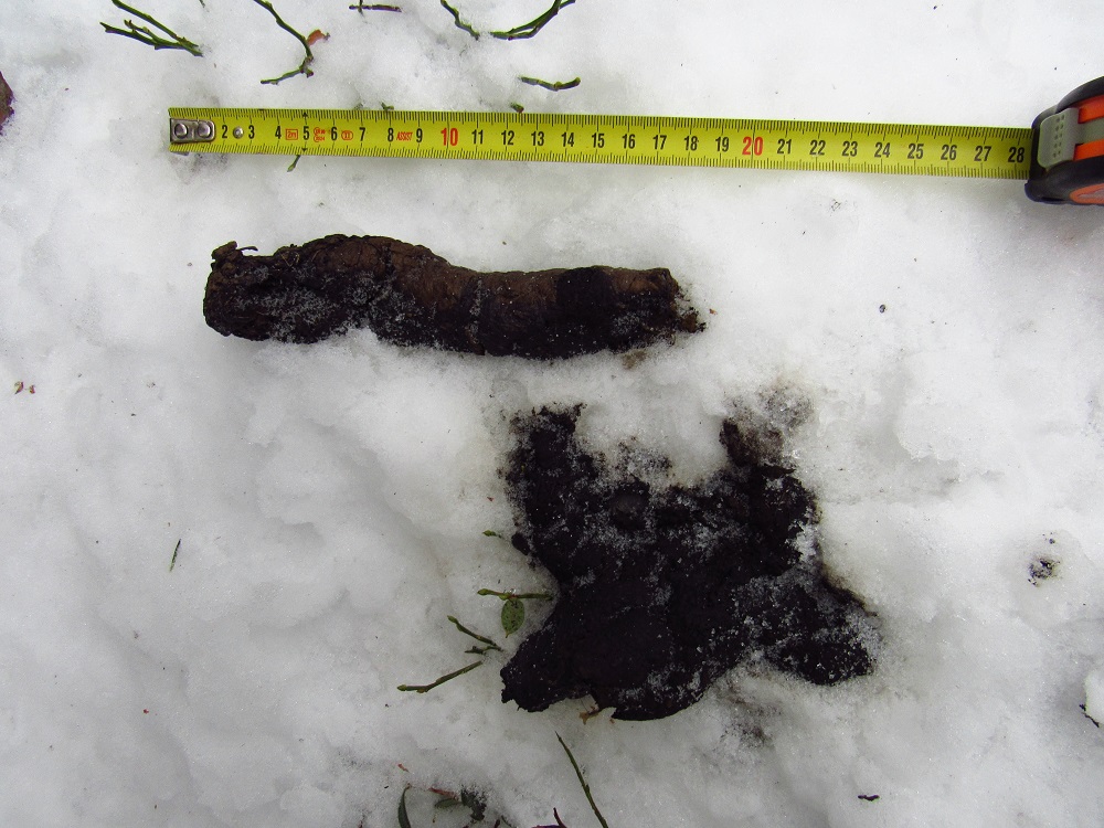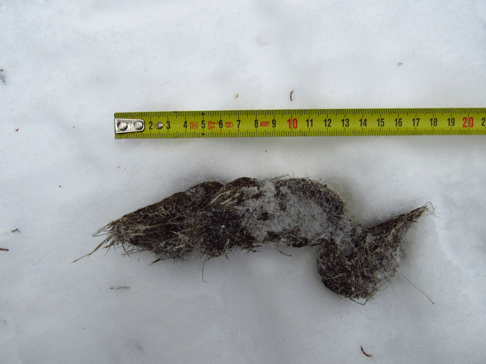 vlk obecný, pobytové znaky trus. Všimněte si velkých kusů kosní, které obsahuje uvnitř./ gray wolf (canis lupus), scat. Notice large bone fragments inside the scat.