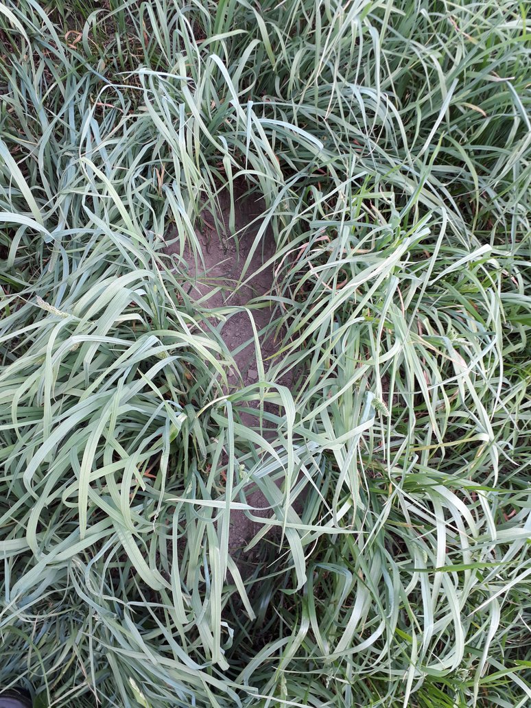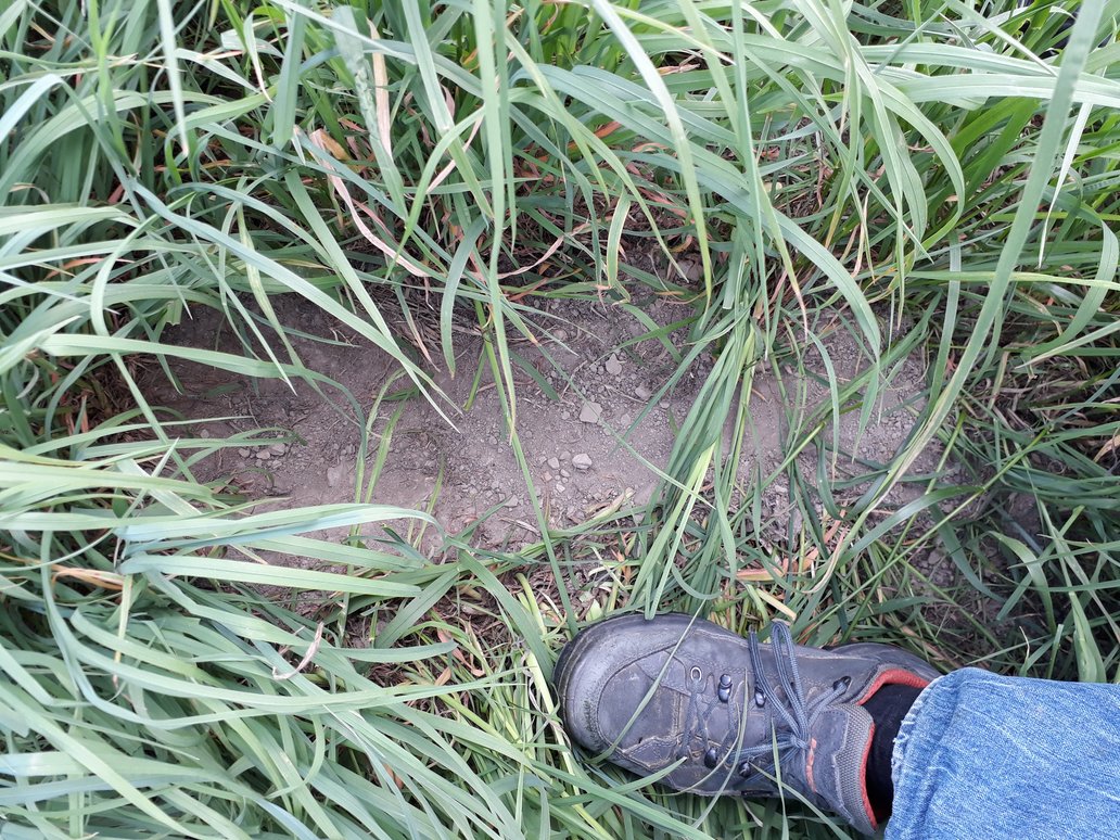Po odhrnutí trávy je vidět mělce vyhrabaný pelech.
