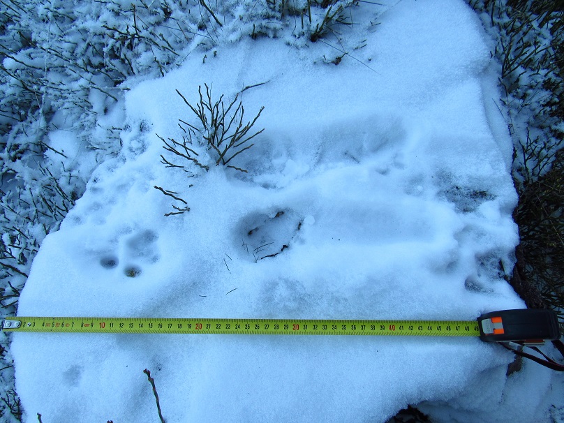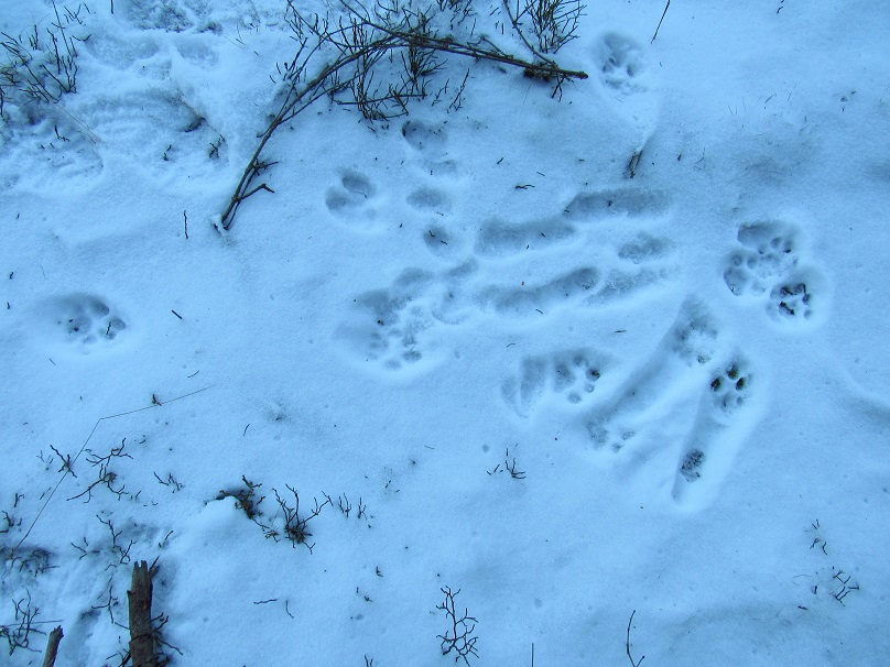 Je to teď z víkendu, zaujalo mě na tom, že to boří klasickou teorii o "kulaté stopě. Ale i tady to prozradí patní mozol a kočičí uspořádání prstů vedle sebe. Foceno kousek od té kazatelny, hihi asi mu na zledovatělé cestě taky trochu klouzaly tlapky