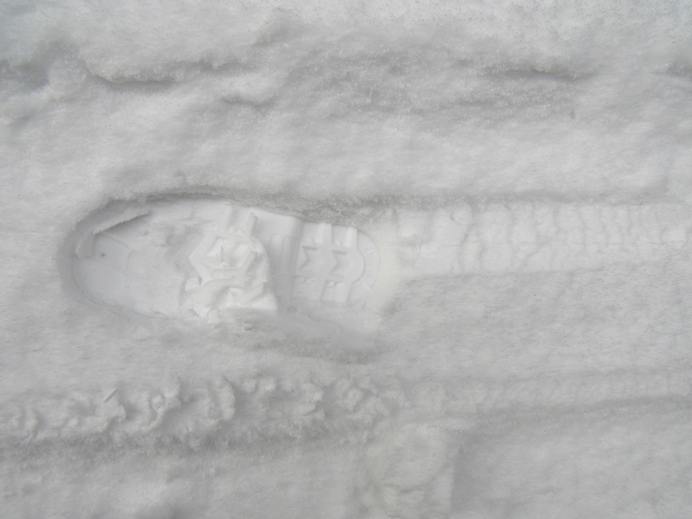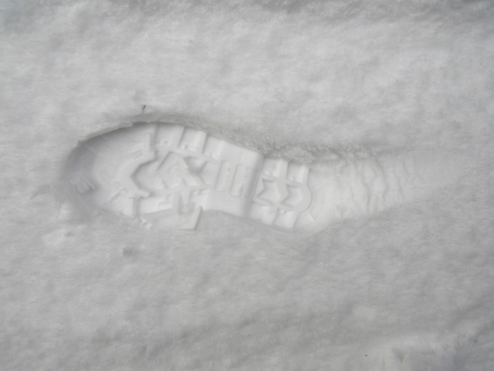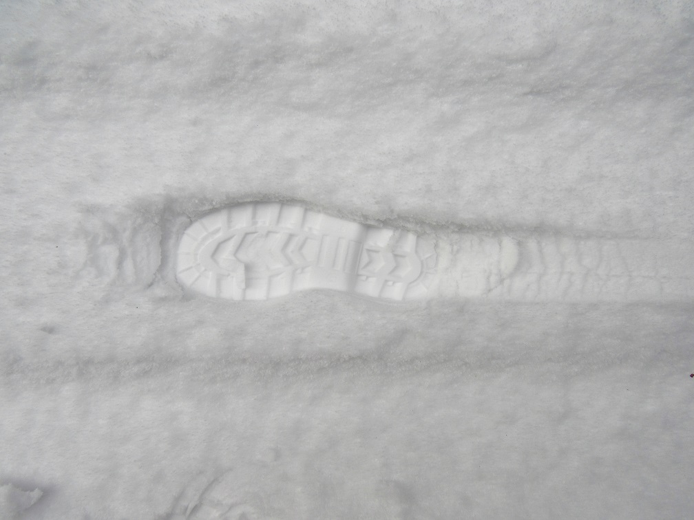Rychlá chůze (sníh vykopnutý špičkou, stopa se láme, odpichující přední část chodidla rozdrolí vzorek)