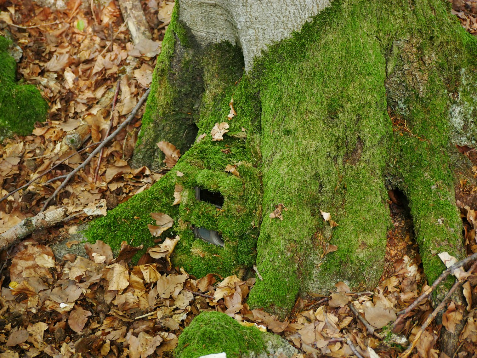 Maskování fotopastí: Detail ukryté fotopasti. Listy jsou však uchycené velmi nedostatečně, je štěstí že na pasti vydržely a nepřekryly objektiv nebo některé z čidel