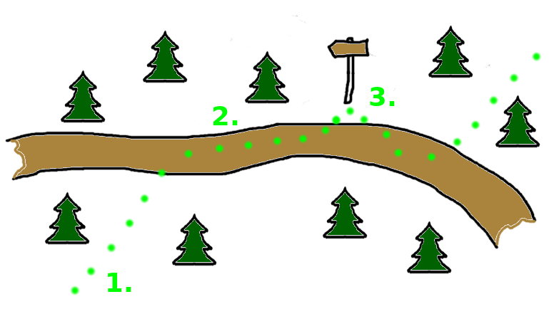 1. Stopa přichází ze směru mimo stezku.