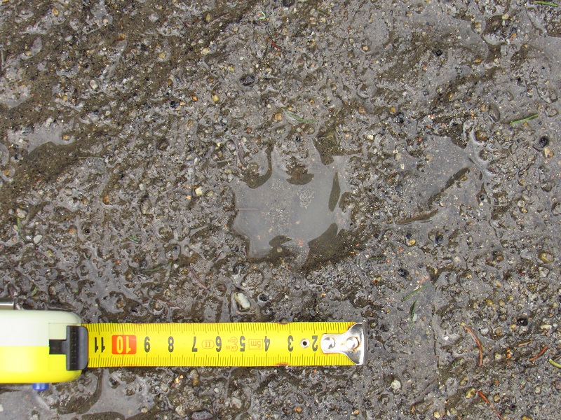 Dobrá stopa - otisk paty není skoro vidět, ale drápy a velikost ho prozradí: Jezevec má pět prstů (stejně jako mmj další lasicovití, např. třeba vydra) a k tomu velmi dlouhé drápy. Hezky je to vidět tady).