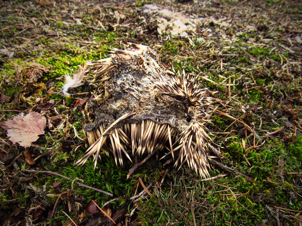Výr velký (bubo bubo), zbytky ježka. Poznámka: Ježci jsou pro výra velkého vcelku typickou kořistí a nález podobných zbytků naznačuje přítomnost této velké sovy. / Eagle-owl, hedgehog remains. Note: Hedgehogs are quite typical prey for eagle-owl and remains like these indicates presence of this large owl.