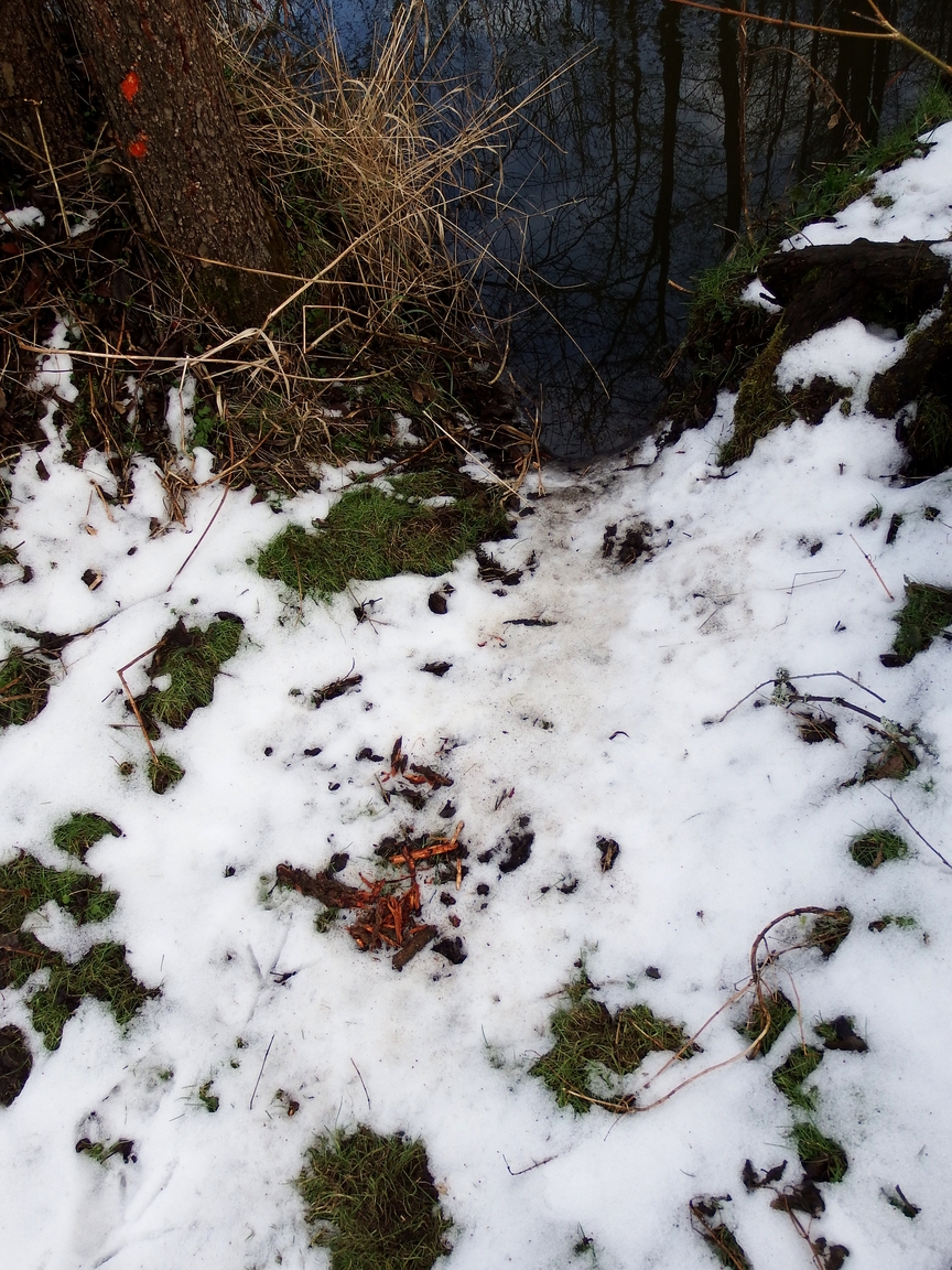 Další výstup z vody (povšimněte si špinavého sněhu a kousků větviček). Bobří "zrcátko" je vidět na stromě vlevo nahoře: