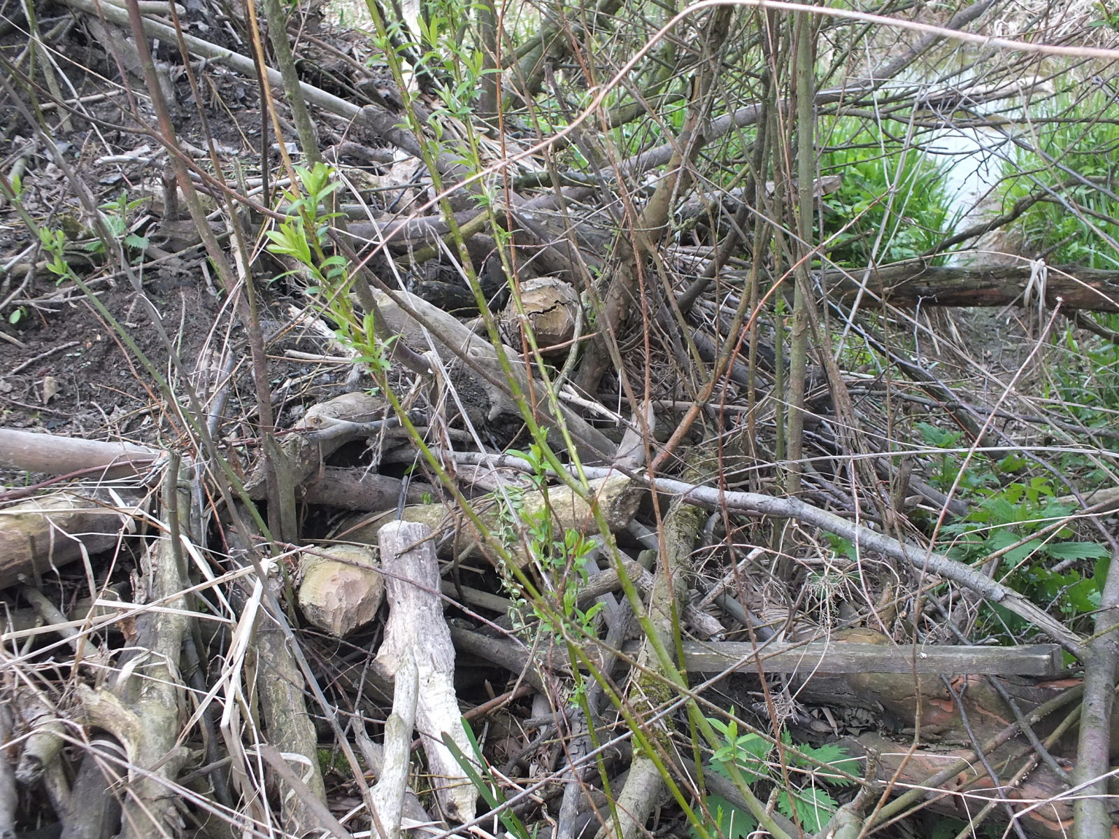 Detail. Na první pohled mohou bobří stavby někdy působit jako naplaveniny, povšimněte si však větví pevně zabudovaných do zbytku stavby.