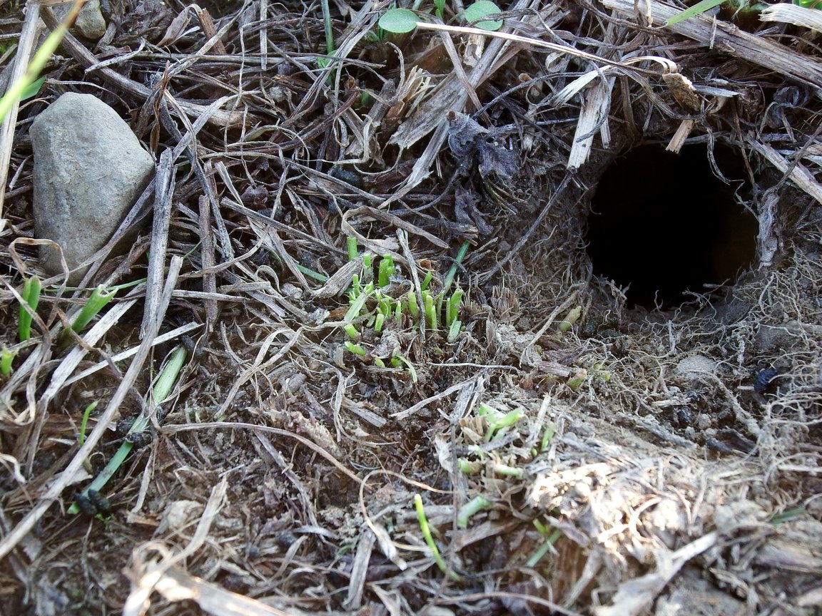 Common vole (Microtus arvalis) is a basic prey for a numbers of predators. The common biotope of the common voles are pastures, fields and meadows. We can identify an active den thanks to a scat in the paths and a chewed plants. We can also often see small pieces of grass around the den.